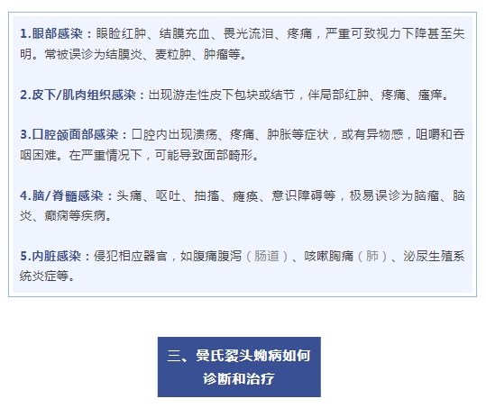 一旦出現(xiàn)可疑癥狀如不明原因的皮下包塊、反復(fù)眼疾、頭痛等,感到身體不適,務(wù)必到正規(guī)醫(yī)療機(jī)構(gòu)就診,科學(xué)治療,勿信偏方。