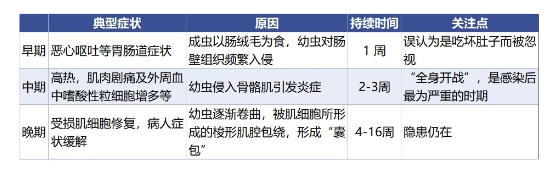 成蟲期:成蟲會(huì)在人體的小腸中停留幾周甚至幾個(gè)月來“產(chǎn)子”(卵胎生)。產(chǎn)出的幼蟲“寶寶”穿透腸壁,隨著血液和淋巴系統(tǒng)擴(kuò)散到全身肌肉中,形成“囊包”。