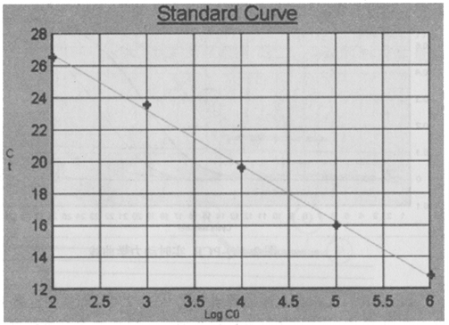 ABI公司首先根據(jù)上述原理研制了ABI 7700 等系列定量PCR儀,在PCR反應中設置標準模板系列(一般5~7個標準濃度)反應管和空白對照管。通過實時檢測反應管中的熒光信號,計算出RQ+、RQ-、△RQ。RQ+代表樣品管熒光報告基團發(fā)光強度與淬滅基團發(fā)光強度的比率,RQ-代表空白管中二者的比率,△RQ(△RQ = RQ+-RQ-)代表PCR過程中熒光信號變化量。當熒光信號增強到某一閾值(根據(jù)熒光信號基線的平均值和標準差,計算出以99.7%的置信度大于平均值作為閾值)時,標準模板反應管所用的循環(huán)次數(shù)(Ct值)就被記錄下來。Ct值與標準模板數(shù)量的對數(shù)值之間有嚴格的線性關系[3],利用系列標準模板的Ct值,制成標準曲線(圖3),根據(jù)待測樣品的Ct值,就可在標準曲線中確定待測樣品起始的DNA數(shù)量。根據(jù)數(shù)據(jù)處理,即可得出定量結(jié)果。探針設計一般應符合以下條件[2]:①探針長度應在20~40個堿基左右,以保證結(jié)合的特異性。②GC堿基含量在40%~60%,避免單核苷酸序列的重復。③避免與引物發(fā)生雜交或重疊。④探針與模板結(jié)合的穩(wěn)定程度要大于引物與模板結(jié)合的穩(wěn)定程度,因此探針的Tm值要比引物的Tm值至少高出5℃。另外,探針的濃度,探針與模板序列的同源性,探針與引物的距離都對實驗結(jié)果有影響。