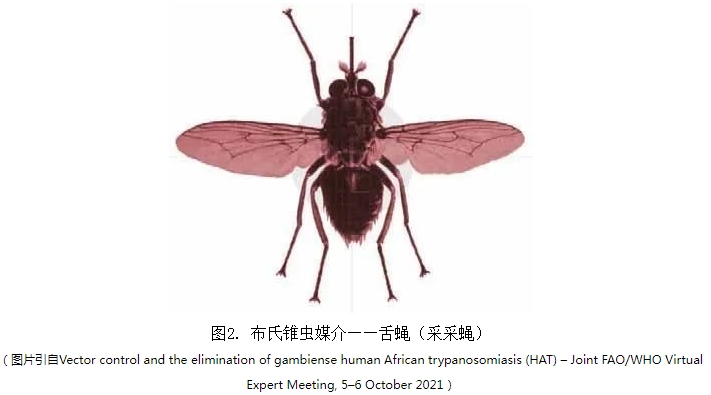 經舌蠅(如圖2)叮咬、母嬰垂直傳播、輸血或器官移植等途徑均可感染布氏錐蟲。