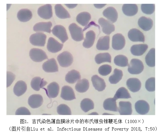 三是實驗室檢查病人血清中布氏錐蟲抗體是否陽性,病人血液、淋巴液、下疳抽吸液、骨髓穿刺液或腦脊液鏡檢中是否查見布氏錐蟲錐鞭毛體(如圖4),或布氏錐蟲核酸檢測陽性。