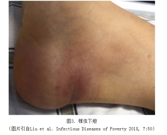 發熱、頭痛、瘙癢、肌肉疼痛、骨骼疼痛、表情淡漠、共濟失調、嗜睡和昏睡等癥狀,錐蟲下疳(gān)(如圖3)、淋巴結腫大、肝脾腫大等體征。其中,岡比亞錐蟲病發病進程慢,而羅得西亞錐蟲病發病進程快。}