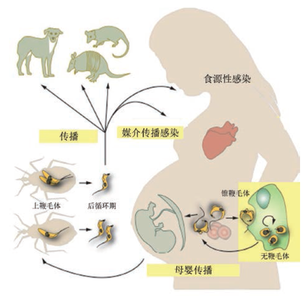 恰加斯病主要經(jīng)“接吻蟲”錐蝽傳染(圖 2),錐蝽夜間吸血時(shí),不會(huì)直接通過(guò)唾液傳播,而是將含有克氏錐蟲的糞便排泄在人體皮膚上。當(dāng)人被叮咬后抓撓,寄生蟲通過(guò)傷口或黏膜(如眼、口)侵入體內(nèi)??耸襄F蟲也可以通過(guò)輸血、器官移植和垂直傳播(母嬰傳播)。另外,亦可通過(guò)實(shí)驗(yàn)室意外感染發(fā)病,食用受污染的食物或飲料傳播。(如圖3)
